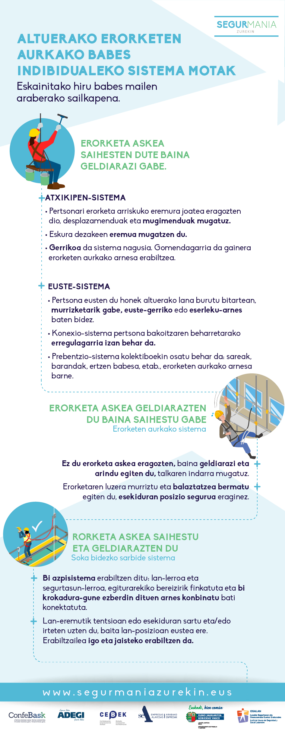 Altuerako erorketen aurkako banakako babes-sistemak erorketa askeak ekidin edo gerarazteko diseinatuta daude. Aurreko infografia batean azaltzen genuen bezala hiru oinarrizko elementu dakartzate: gorputza heltzeko arnes edo gailu bat zein konexio sistema bat erabiliz ainguratze gune batekin konektatzen den. Baina erorketen aurkako banakako babes-sistema guztiak ez dira berdinak, eta ez dute berdin babesten. Horregatik gaurkoan gure infografiak altuerako erorketen aurkako banakako babes-sistema motak zehazten ditu, eskaintzen duten babes mailaren arabera antolatuta.
