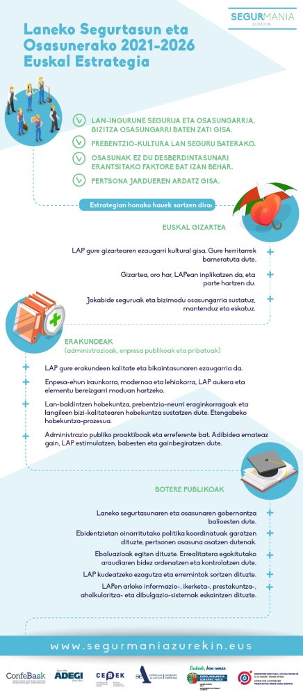 Laneko Segurtasun eta Osasunerako 2021-2026 Euskal Estrategia geure burua gidatzeko tresna bat da. LAP bultzatzen jarraitzeko eta lanean osasunari egindako kaltea desagerrarazteko lanean jarraitzeko erreminta da. Instrumentu partekatu eta parte-hartzaile honetan guztiok gaude inplikatuta, eta prebentzio-kultura lortzearen aldeko apustua egiten du, enpresen, gizarte-eragileen eta langileen erabaki guztietan eragina izateko.