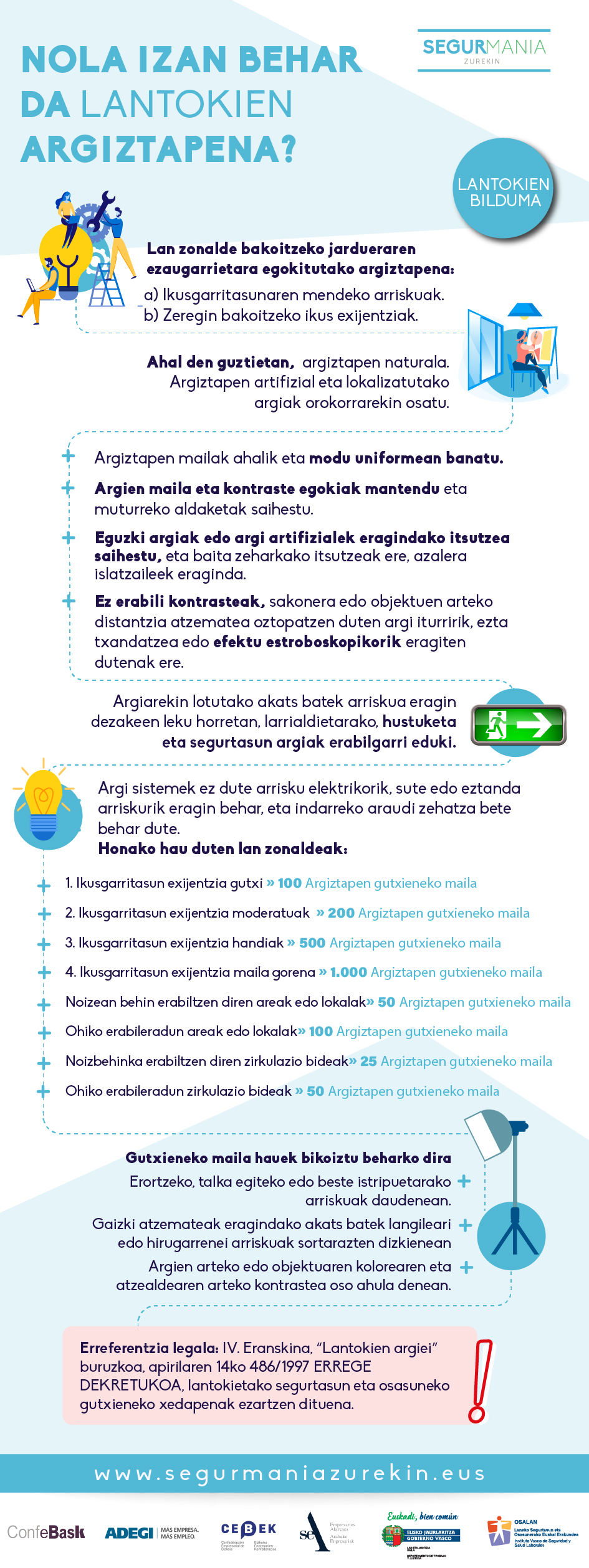 Lantokiko argiztapena oso kontuan hartu beharreko oso faktore garrantzitsua da, argi egokiak edukitzea funtsezkoa baita lanpostu bakoitzari dagozkion zereginak modu seguruan eta oztoporik gabe garatu ahal izateko. Eta are gehiago: dena delako zeregina langileentzat edo hirugarrenentzat arriskutsuagoa den heinean, argiztapena gero eta garrantzitsuagoa da.