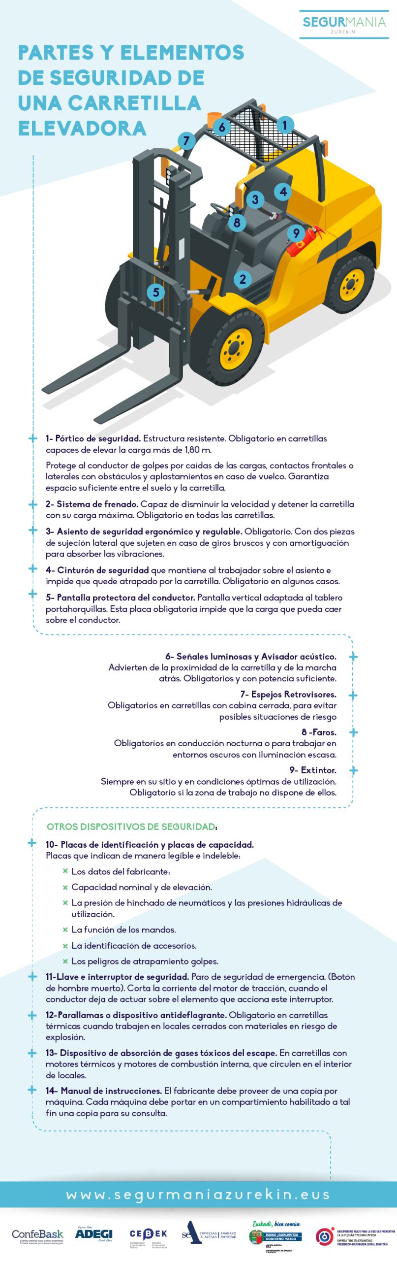 Todas las carretillas deben cumplir con una serie de elementos de seguridad y estar acondicionadas para limitar los riesgos de vuelco y para proteger al conductor u ocupantes de la carretilla de los riesgos de atrapamiento en caso de vuelco.